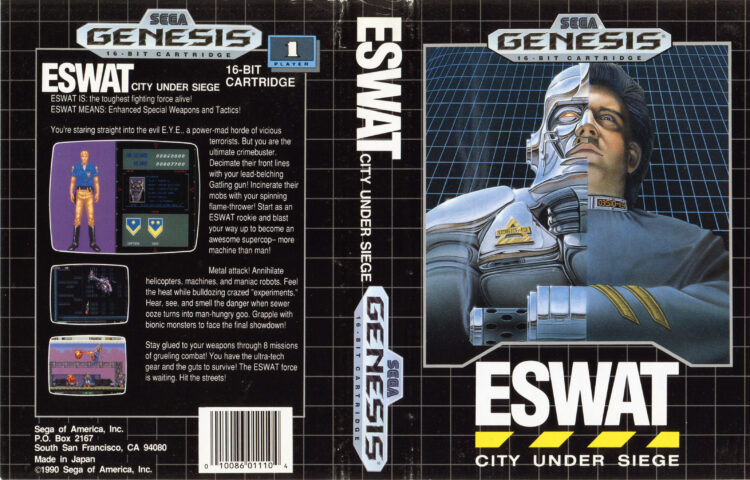 ESWAT: City Under Siege (1990) is the home console reimagining of Sega’s System-16 arcade action game Cyber Police ESWAT (1989). While both games are clearly inspired by the hit 1987 movie Robocop, they are completely different. However, both involve accomplished police officer Duke Oda fighting powerful criminal syndicates before being accepted into the Liberty City PD’s “Enhanced Special Weapons and Tactics”, or ESWAT, unit and fitted into a powerful cybernetic exoskeleton. With this, he’ll begin fighting similarly outfitted criminal groups and, eventually, the evil and all-powerful AI supercomputer known as E.Y.E.