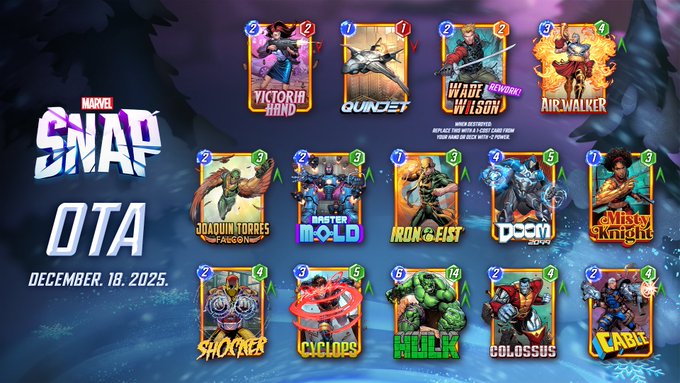 Team Clash is here!Dive into Marvel Snap’s NEW limited time game mode and play as your favorite Marvel team.Use unique Team abilities to fight for supremacy!Also MARVEL SNAP and Game On Events present: Snowball Showdown!Score Snowball Points by taking & keeping Conquest cubes. Decks must run at least ONE new card from Dec 1 to Jan 9. Chamber, Weapon H, Weapon X, etc.Event begins Jan 10! More details coming soon.
