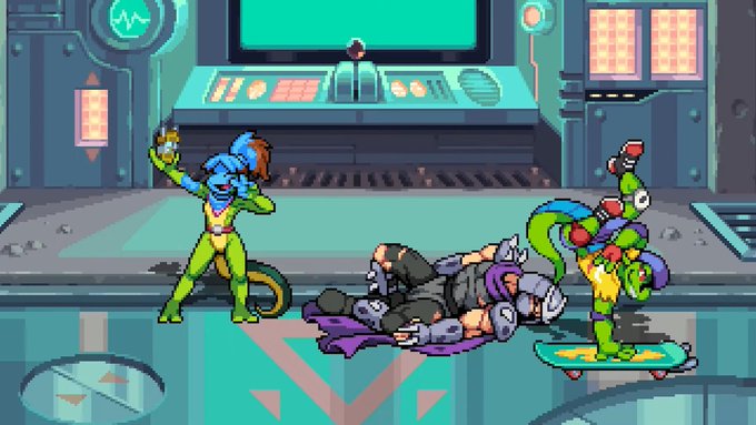 Radical Reptiles introduces two fan-favorites as playable fighters:1. Radical surfer and trusted friend to the Turtles: Mondo Gecko2. Physics student turned reptilian rapscallion: Mona LisaWhether it’s by dealing righteous damage on a skateboard or launching deadly chemical concoctions, this powerhouse duo is ready to rumble with the Foot Clan!And that’s not all! A free update is also available for all players: a rockin’ Remix mode of the official soundtrack featuring amazing guest artists:-Anamanaguchi-Jake Kaufman-Keiji Yamagishi-Tomoya Tomita-Sean Bialo-Button Masher