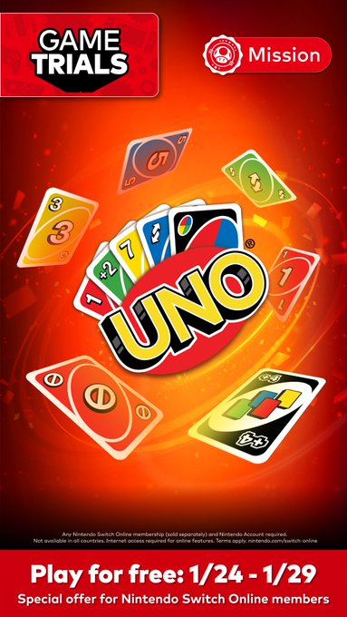 Active Nintendo Switch Online members! From 1/24 at 10am PT to 1/29 at 11:59pm PT, you can download and try the full UNO® game at no additional cost.