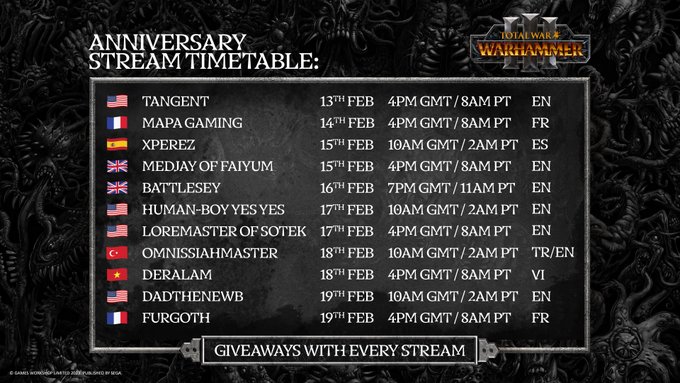 This week marks the 1st anniversary of Total War: WARHAMMER III's launch! 🥳Here's what we have lined up for this week's anniversary streams from some of our favourite content creators! They'll all be going live on their own channels with code giveaways in every stream - don't forget to set a reminder so you don't miss out! ⏰