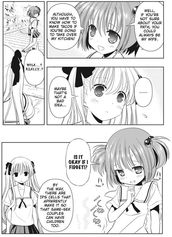 There is also a romance between girls in that world.