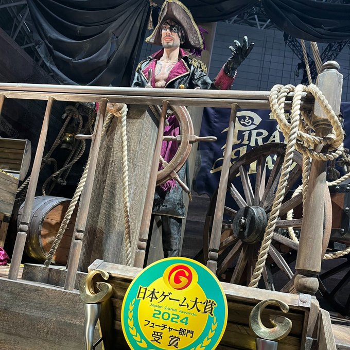 Here's Director of RGG Studio / Executive Producer Masayoshi Yokoyama showing off the awards aboard the Like a Dragon: Pirate Yakuza in Hawaii booth at TGS2024