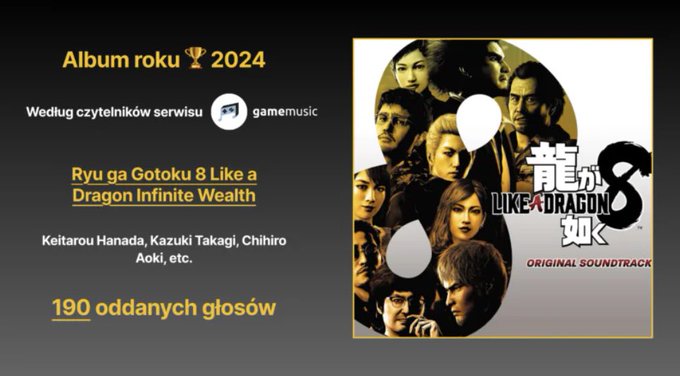 【Congrats】In the "Game music album of the year 2024." hosted by Game Music editing office (from Poland), "Like a Dragon: Infinite Wealth - OST" was voted as the best album of 2024 by readers🏆✨
