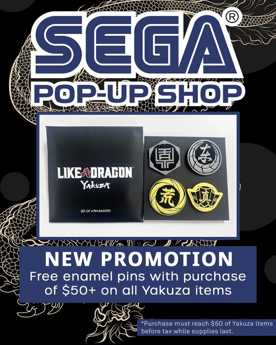 Come get an exclusive Yakuza enamel pin with a purchase of $50 total before tax on Yakuza items! *available while supplies lastDATE: JUNE 27th, 2025 - JULY 27th, 2025TIME: 12:00pm-7:00pm EVERYDAY📍 LITTLE TOKYO, LOS ANGELES CA319 E 2nd St, Los Angeles, CA 90012