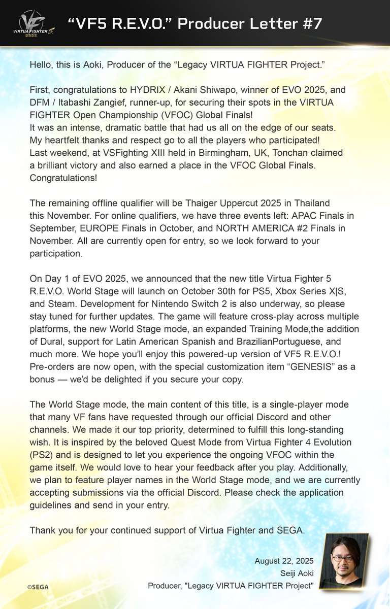 At Evo 2025, IGN had the chance to sit down with Riichiro Yamada, the producer of the new Virtua Fighter Project, and ask him about his vision for the series, how gameplay might change from the older games, and who the heck Stella might be!The concept gameplay that we've seen for the new Virtua Fighter project has been very fluid with guards going for each individual attack, the arms moving to block each individual attack. How close to this do you expect the final game to look? In terms of how it looks, yes, [the battle system is] 70% there, and tomorrow there will be an announcement made at EVO [Editor’s Note: This interview was recorded the day before the trailer release]. So I really feel that I’ll be able to showcase what the current situation is. And from a vision perspective, I really have a very strong vision and really feel that we are getting very close to that vision.So fighting games are in a very different place than they were when Virtua Fighter V was released. What are some of the ways that you're ensuring that the new Virtua Fighter project will modernize the series?Virtua Fighter originally was a very simple game. It only has three buttons and everyone could basically touch and play it, but as the series went on, it became very complicated. And in terms of that and in terms of the progression, I feel that Virtua Fighter 5 is the complete version. In terms of a new Virtua Fighter, we need to keep progressing even more, not just in the gameplay but function as well.I really feel that I need to look towards how do we progress this game, how do we improve this game, in terms of functionability, gameplay and how do we make it more modernized? Otherwise, I really feel like it won't sell. So those are the ...