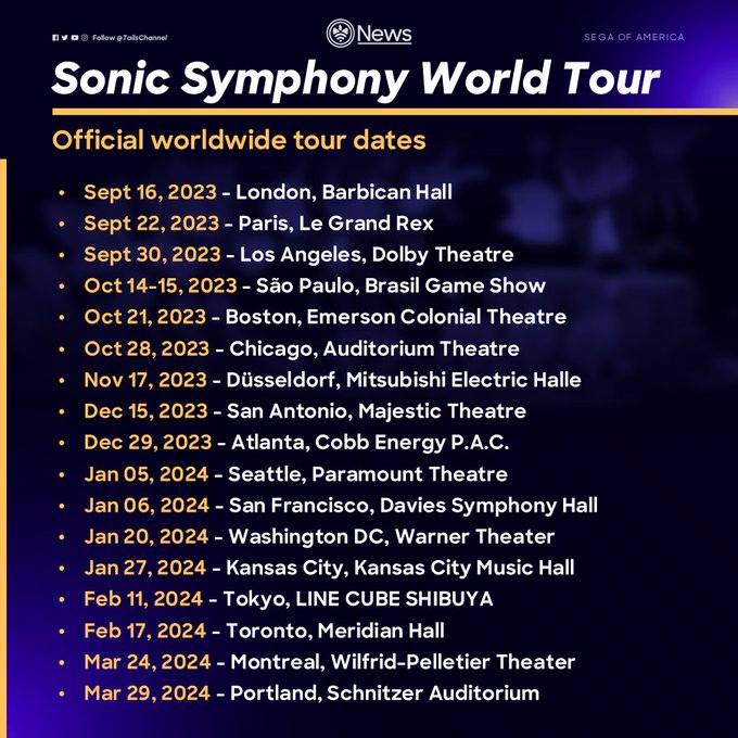 ⚡ Here are the official worldwide tour dates for the Sonic the Hedgehog Symphony World Tour in 2023 and 2024.