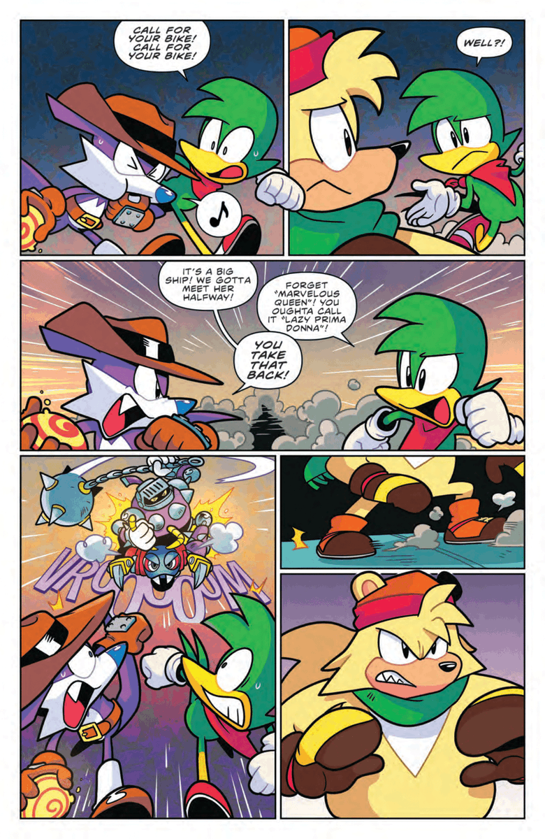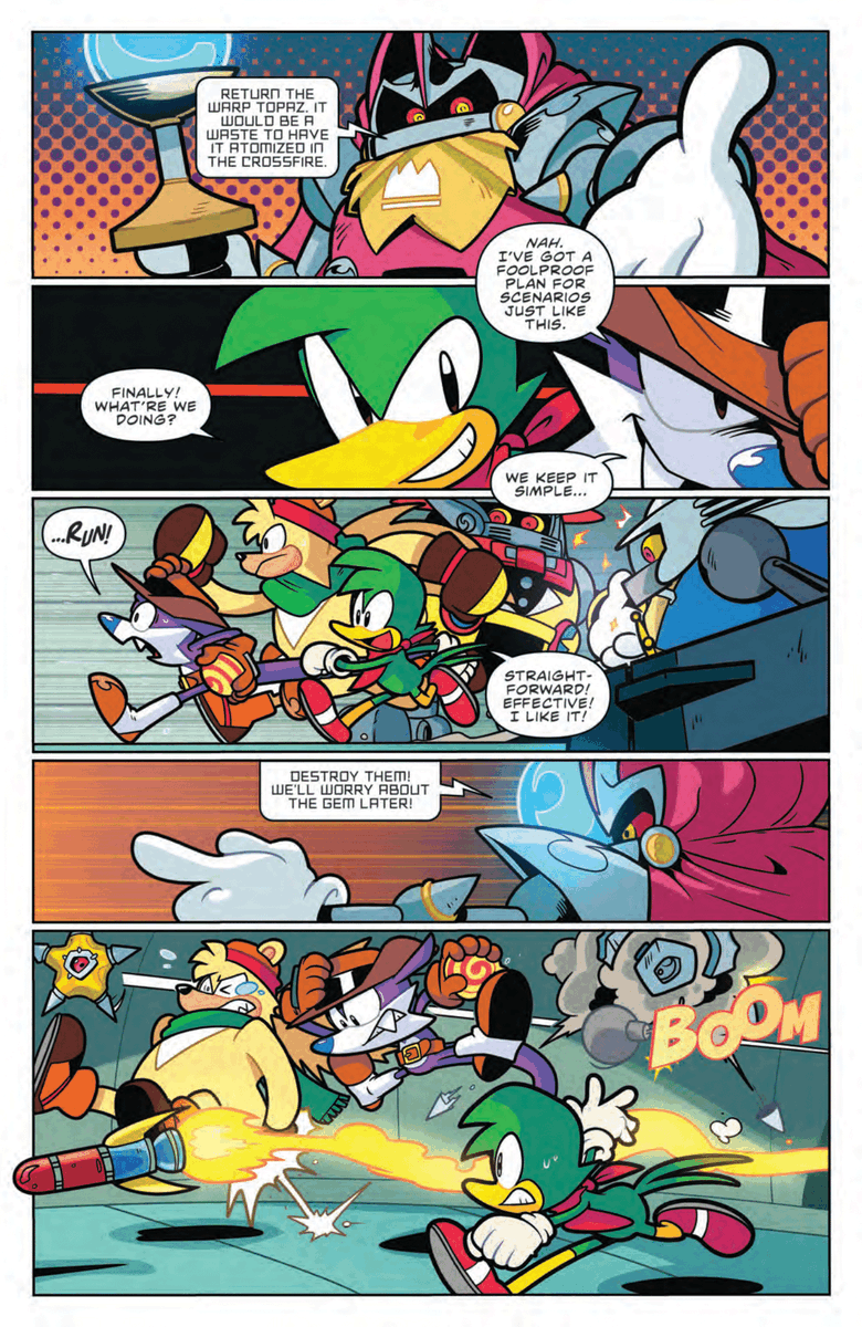 Secrets revealed! Fang has finally cornered a lead on the fabled eighth Chaos Emerald! If only he, Bark, and Bean weren’t finding themselves cornered by their heavy competition! Can Fang escape the Heavy Wing with his prize, and his partners, intact? And how do Sonic and Tails get dragged into this mess? Find out in the thrilling conclusion to the first Classic-era miniseries!