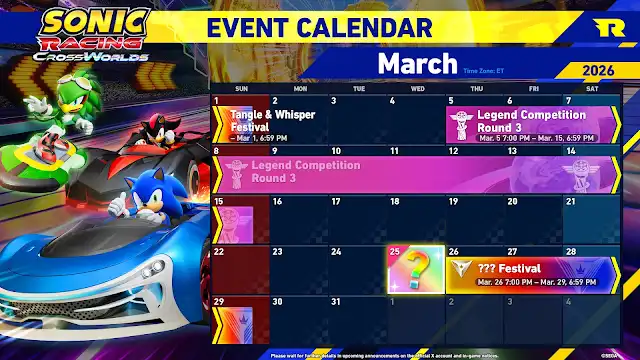 Sonic Racing: CrossWorlds hosts Legend Competition Round 3 from March 5-15, promises new characters on March 25, a Festival March 26-29, online bonuses through March 29, and a Nintendo Switch 2 physical edition on March 26.