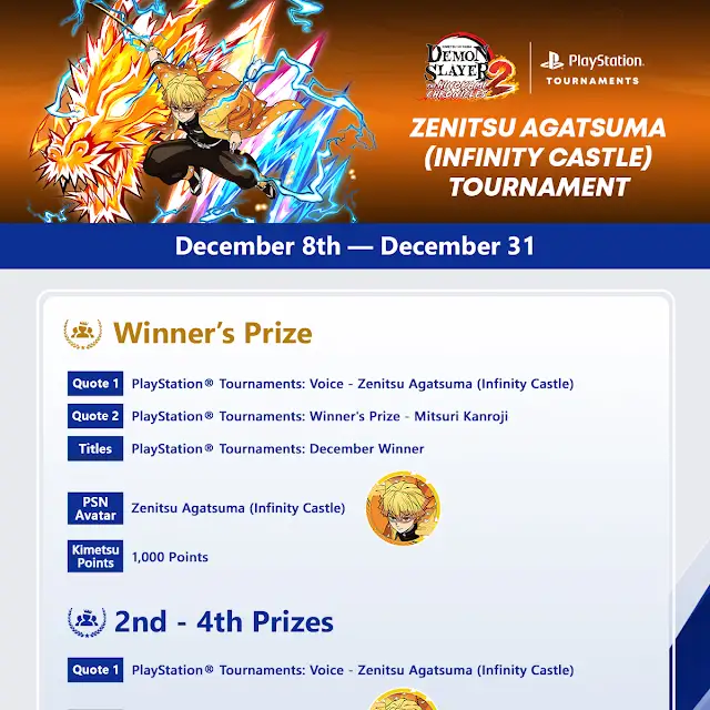 To commemorate the launch of Demon Slayer -Kimestsu no Yaiba- The Hinokami Chronicles 2's Zenitsu Agatsuma (Infinity Castle) Character Pack, a special PlayStation Tournament has began.