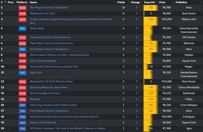 1 [PS5] Dragon's Dogma 2 - 54 / NEW2 [PS5] Rise of the Ronin - 44 / NEW3 [NSW] Princess Peach: Showtime! - 34 / NEW4 [PS5] Final Fantasy VII Rebirth - 17 / 2295 [PS4] Persona 3 Reload - 12 / 84