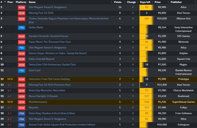 10. [PS5] Metaphor: ReFantazio – 170 votes19. [PS5] Shin Megami Tensei V: Vengeance – 95 votes20. [NSW] Shin Megami Tensei V: Vengeance – 90 votes21. [NSW] Demon Slayer: Kimetsu no Yaiba – Sweep the Board – 87 votes30. [PS4] Shin Megami Tensei V: Vengeance – 60 votes