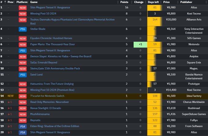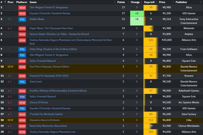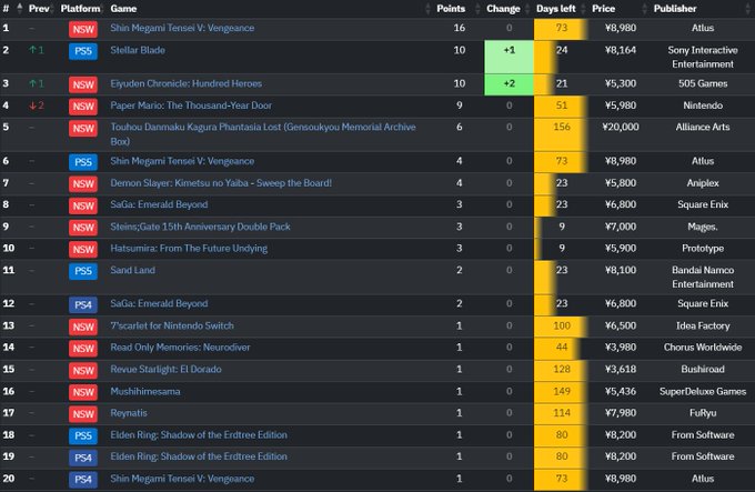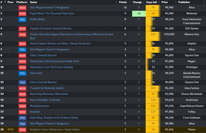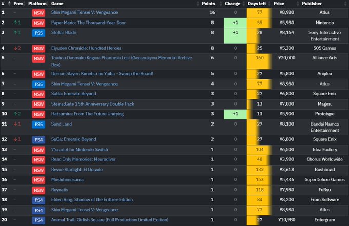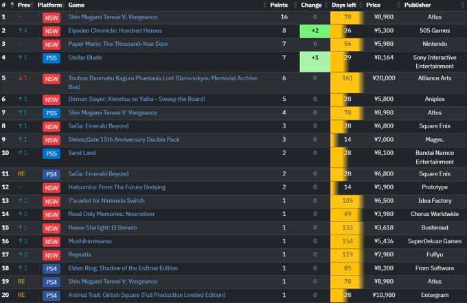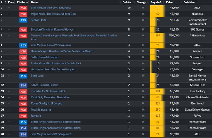 8. [PS5] Metaphor: ReFantazio – 154 votes17. [NSW] Shin Megami Tensei V: Vengeance – 93 votes18. [PS5] Shin Megami Tensei V: Vengeance – 92 votes21. [NSW] Demon Slayer: Kimetsu no Yaiba – Sweep the Board – 82 votes29. [PS4] Shin Megami Tensei V: Vengeance – 61 votes