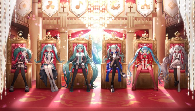6 modules of Mikus are sitting down at the throne room in the World of Miku, when they lay their eyes on you to embrace the moment.