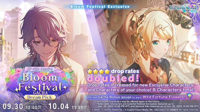 The "JP 4th Anniv. Bloom Festival Gacha Dream Pick" is now available! 🌷Pull the new Rui, Rin, Nene, Shiho, Airi, and Toya cards today~ The banner will run until Oct. 4, 11:59 AM (PT)/ 18:59 (UTC) ✨