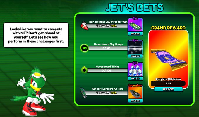 Jet wants to compete with you, win all of Jet's challenges to unlock new chaos and hoverboards!