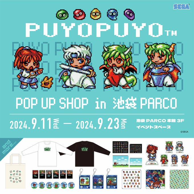 "Puyo Puyo ™ POP UP SHOP in Ikebukuro PARCO"Open for a limited time from Wednesday, September 11th to Monday, September 23rd!We have prepared a total of 28 stylish products that make use of pixel art ✨