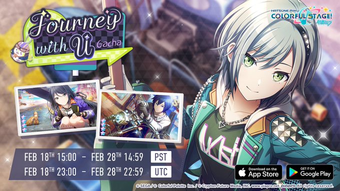 The "Journey with U Gacha" is now available! 🏜Pull the new Shiho, Ichika, and KAITO cards today~ The banner will run until Feb. 28, 14:59 (PST)/ 22:59 (UTC) ✨