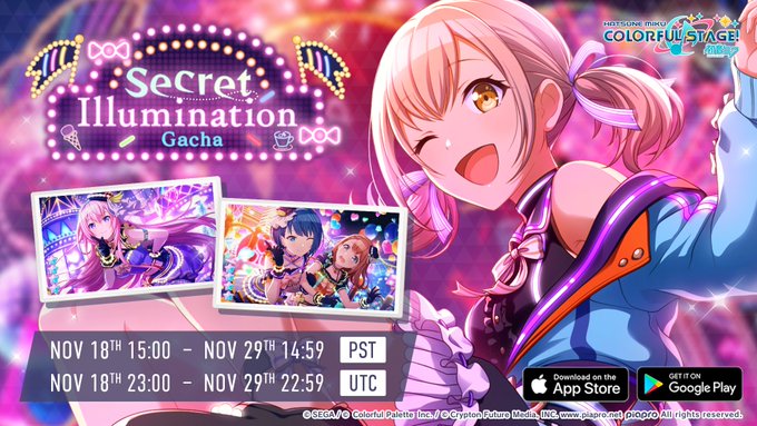 The "Secret Illumination Gacha" is now available! 🎆Get the new Kohane, Luka, and Haruka cards today~ 🎈It will be going until Nov 29, 14:59 (PST)/ 22:59 (UTC)