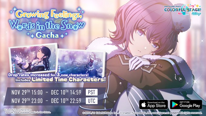 Get ready, because the "Growing Feelings, Words in the Snow Gacha" comes out tomorrow at 15:00 (PST)/23:00 (UTC)~ 🌨
