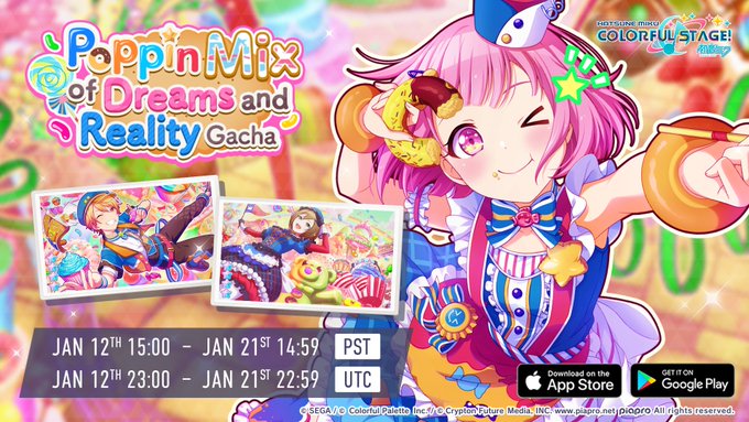 Our next gacha is full of new Cool attribute cards~ 🍬Get ready, because the "Poppin Mix of Dreams and Reality Gacha" pops up tomorrow at 15:00 (PST)/23:00 (UTC)~ 🍭