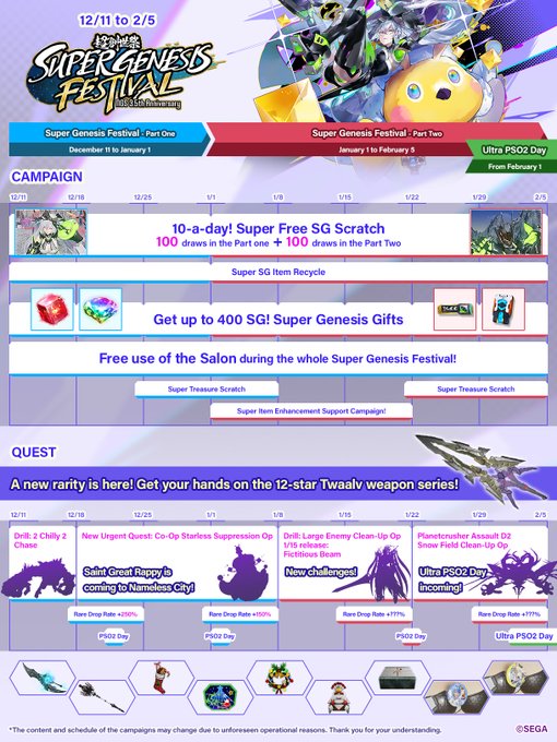 Get 10 free SG Scratch Ticket draws per day during the year-end and New Year period!That's 400 Star Gems, up to +400% boosts on rare drop rates, and more! 💎Don’t miss out on these PSO2NGS campaigns!