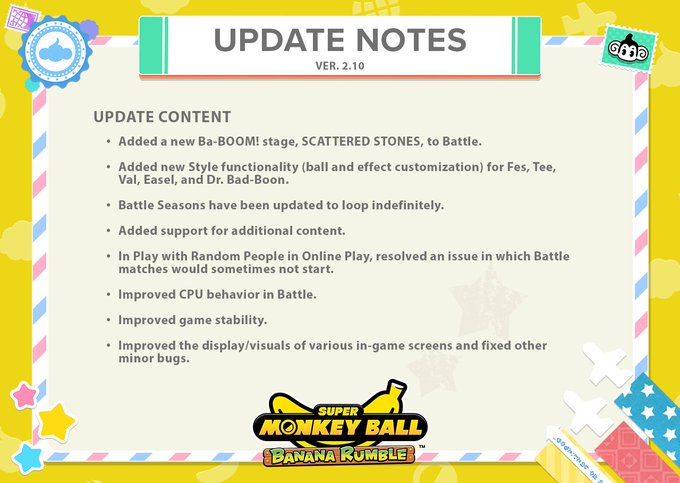 Update 2.10 for Super Monkey Ball Banana Rumble is now live! 🎉