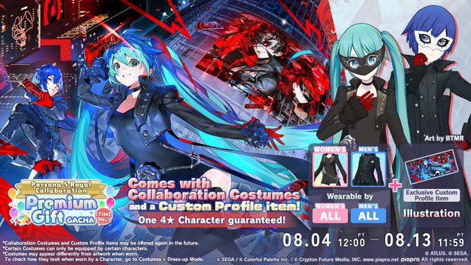 "Persona 5 Royal Collaboration Premium Gift Gacha" is here! 🎉Pull for the new limited-time costumes and an exclusive Custom Profile Item!The banner will run until August 13, 23:59 (PT)/ August 14, 6:59 (UTC)『Life Will Change』Full ver. Video starring Hatsune Miku × Rin Kagamine × Len Kagamine has also been released