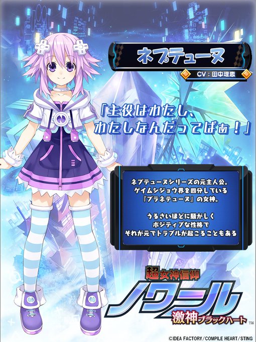 The former protagonist of the Neptunia series and the Goddess of Planeptune.