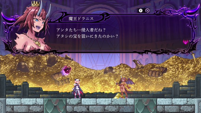 Standing in the way of Kirika and Marsha is the enemy demon lord, Drannis, the Treasure-Hoarding Demon Lord, who has grown gigantic with the power of his treasure and is closing in on them, trying to crush them!