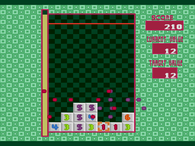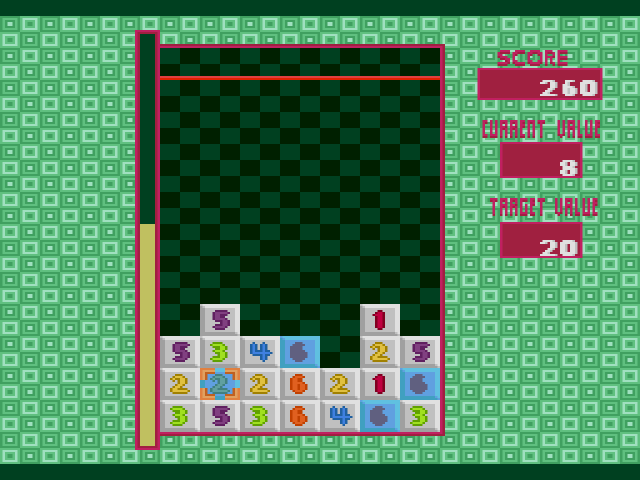 A number based puzzle game for the sega mega drive/genesis where you destroy blocks by matching the target value.  a new row of blocks spawns from the bottom  every time you make a move or your timer runs out. don't let them reach to the top or its game over! and importantly, the target value must be equal to the current value!